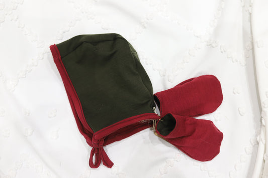 Merino Wool Bonnet and Mitts in Cranberry and Forest